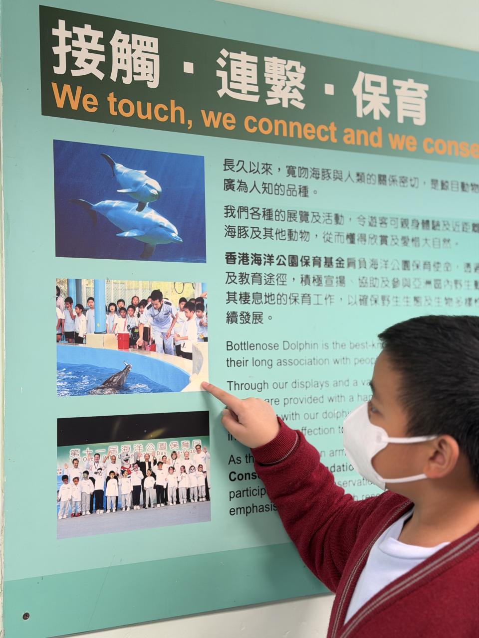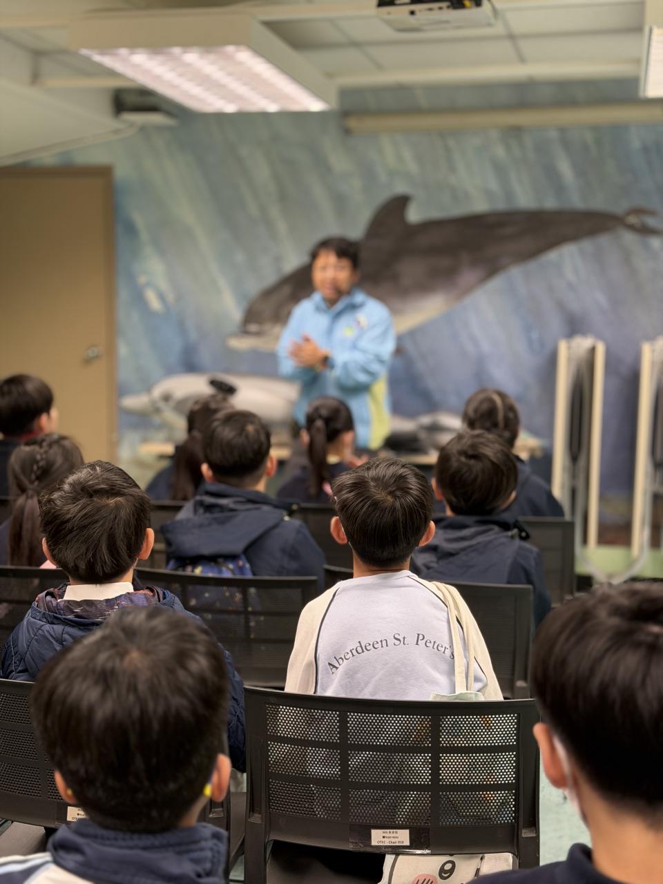 本校學生環境保護大使及小四至小六部分節能大使,前往香港海洋公園參加「搜證遊學豚」活動。同學們認識到海豚的特徵、生活習性與面臨的危機等,他們更踴躍參與搶答環節,勝出的同學贏得與海豚近距離互動的機會。活動中,大家積極向保育員提問,充滿好奇心的同學想知道海豚最長壽命、海豚智商等趣味知識。是次活動讓同學們在實踐中增長見識,了解到海豚面對的生存危機,知道要肩負起保護海洋的責任,亦會以環境保護大使及節能大使的身份,向同學們宣揚愛護環境的信息。 請觀看同學們的訪問,看看他們在這次活動的收穫。