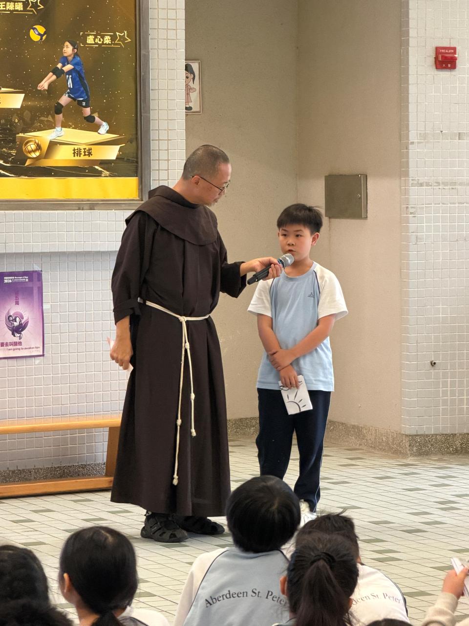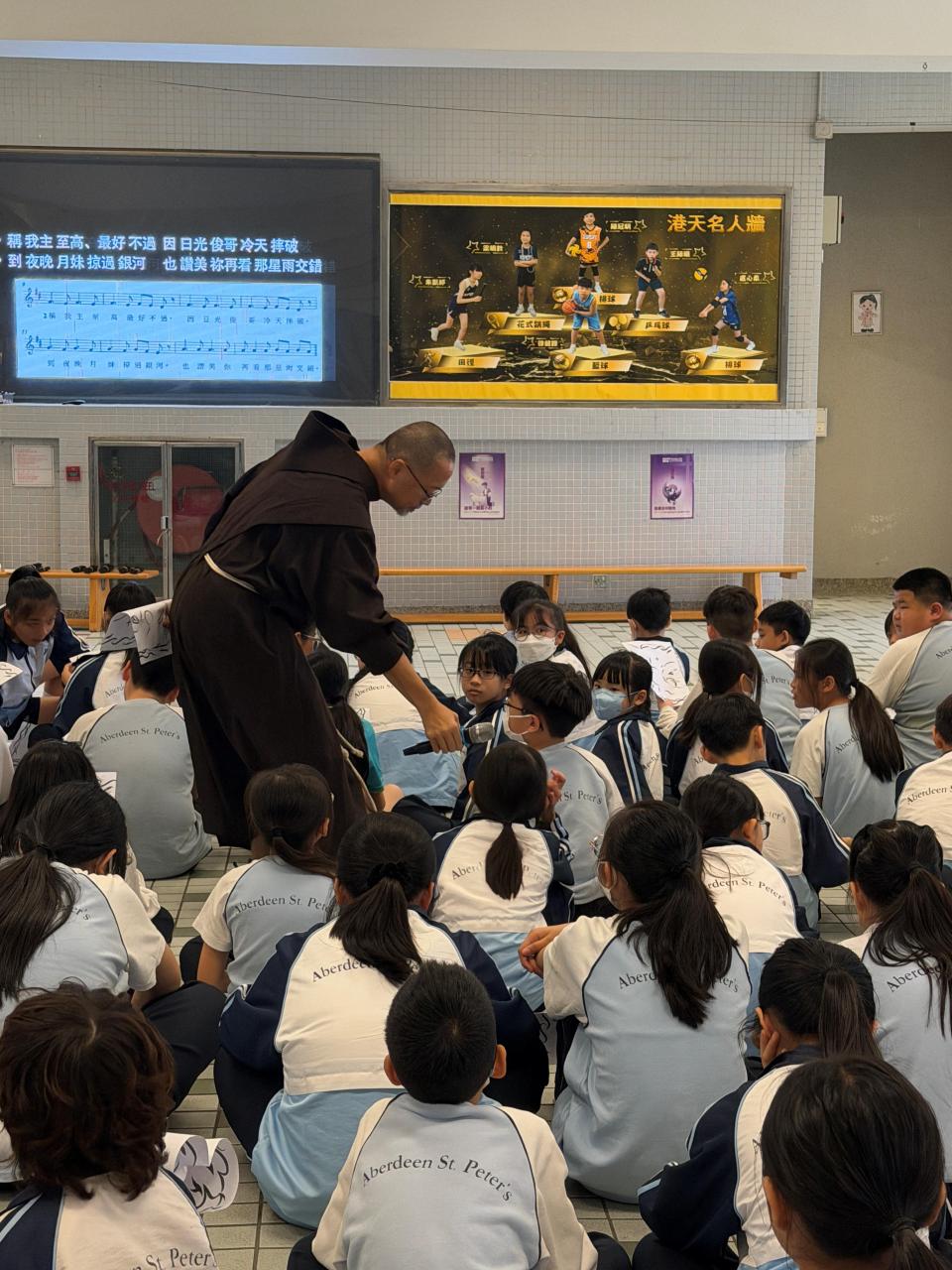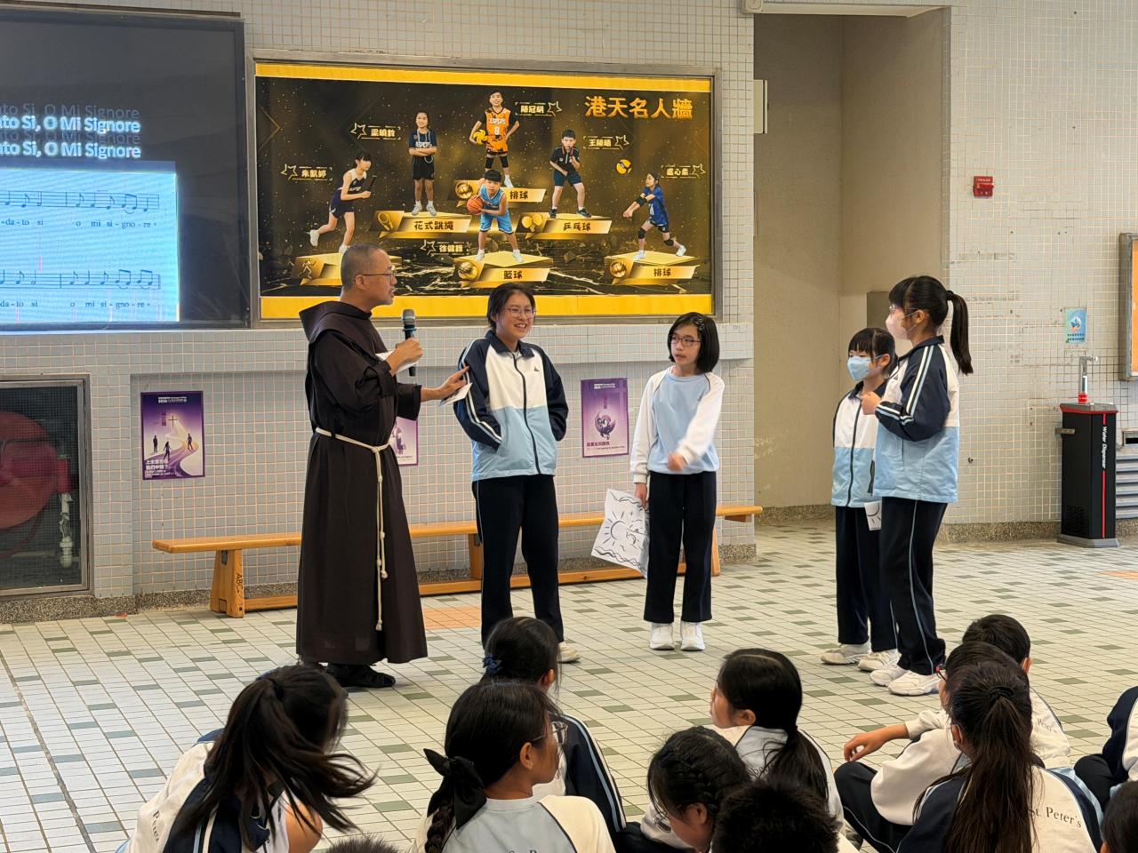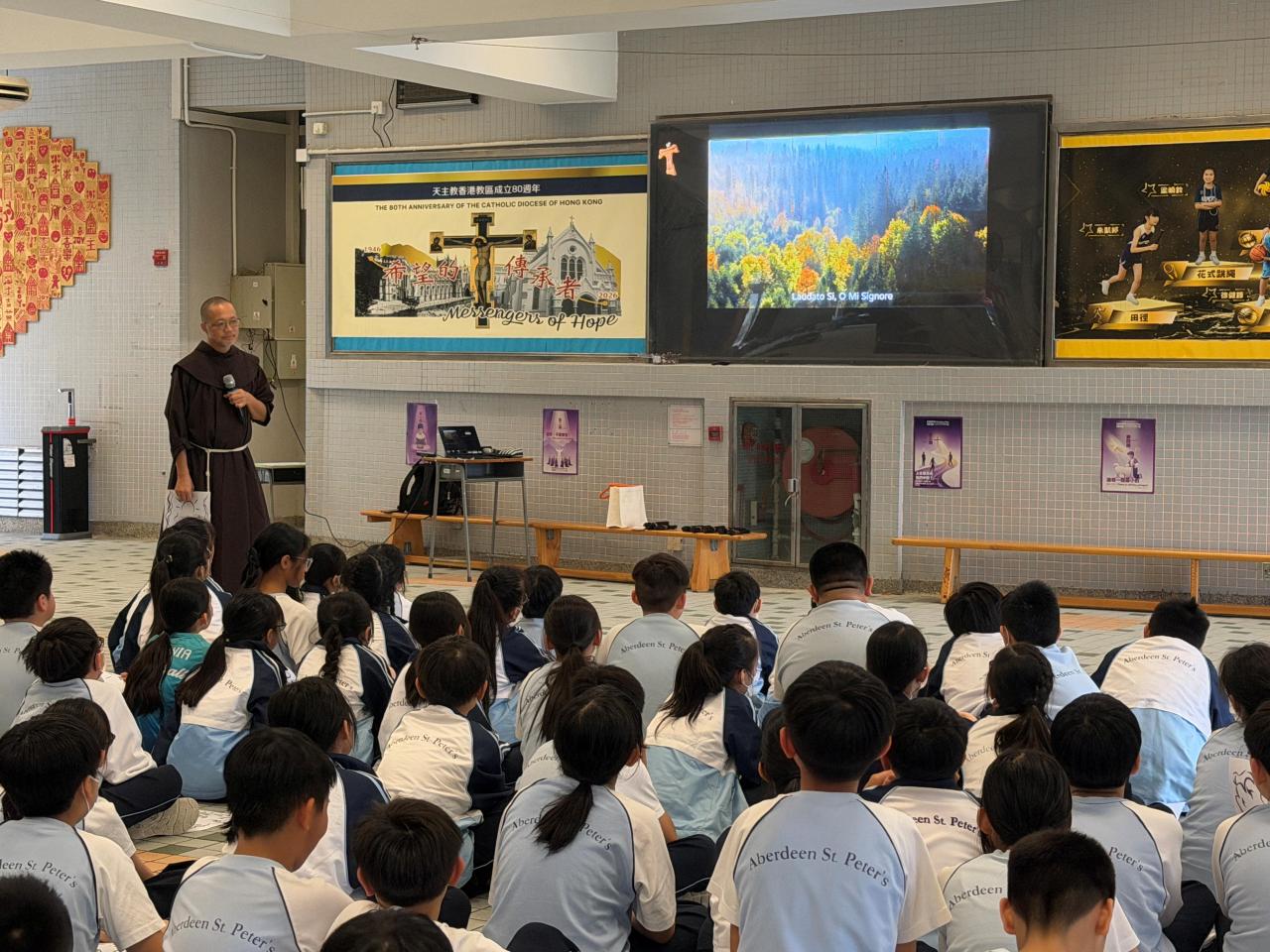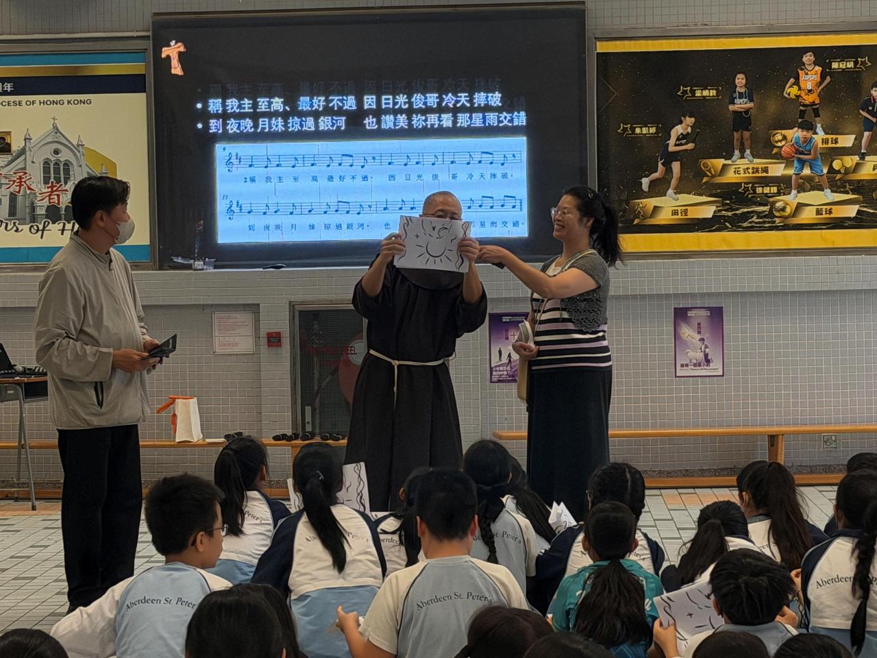 本校參加了賽馬會節能減電學校計劃,於27/03/2026(五)邀請了天主教方濟會的伍維烈修士為我們主持「方濟各遇上聖方濟:唱歌學通諭」講座,學生透過歌唱LAUDATO SI的粵語版,輕鬆學習方濟造物讚及方濟各通諭的重點。