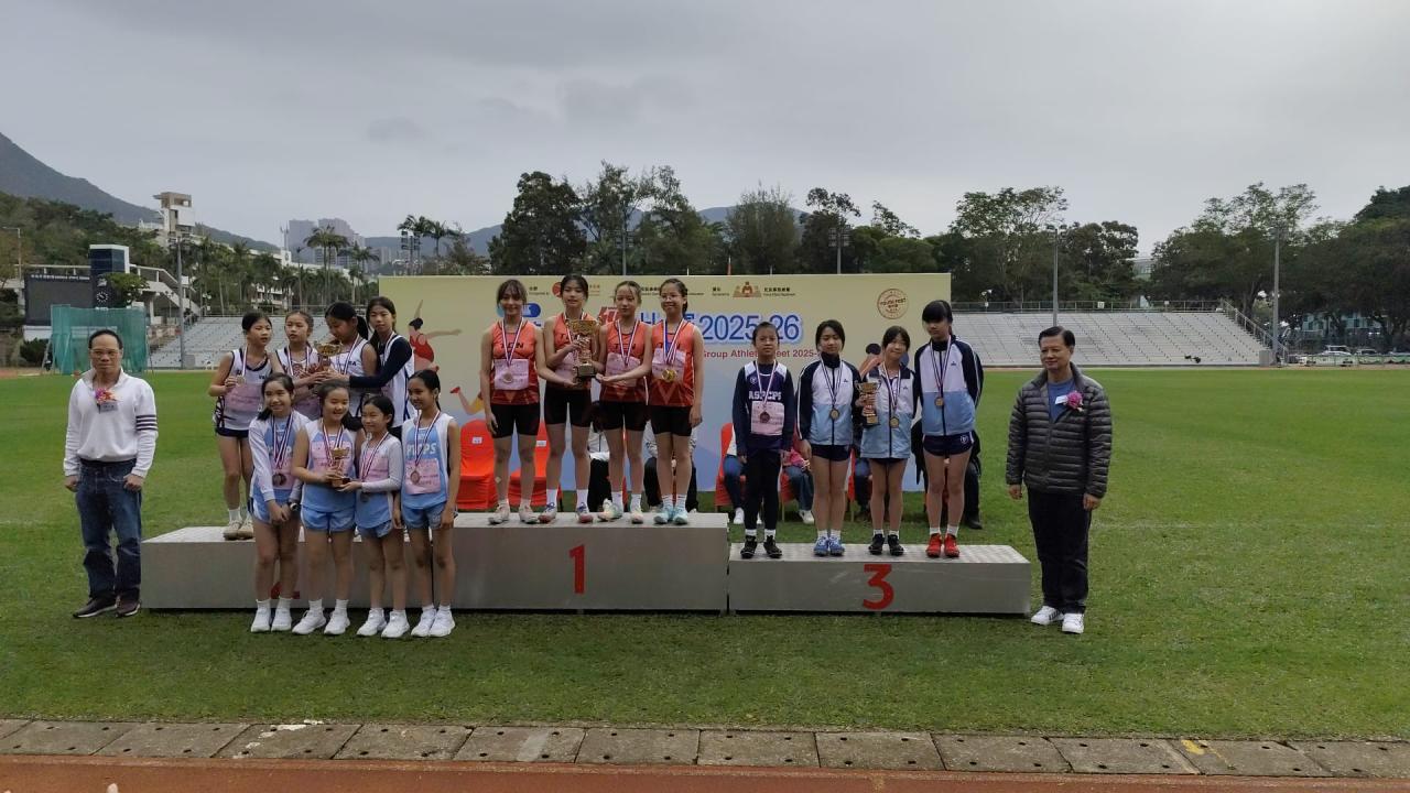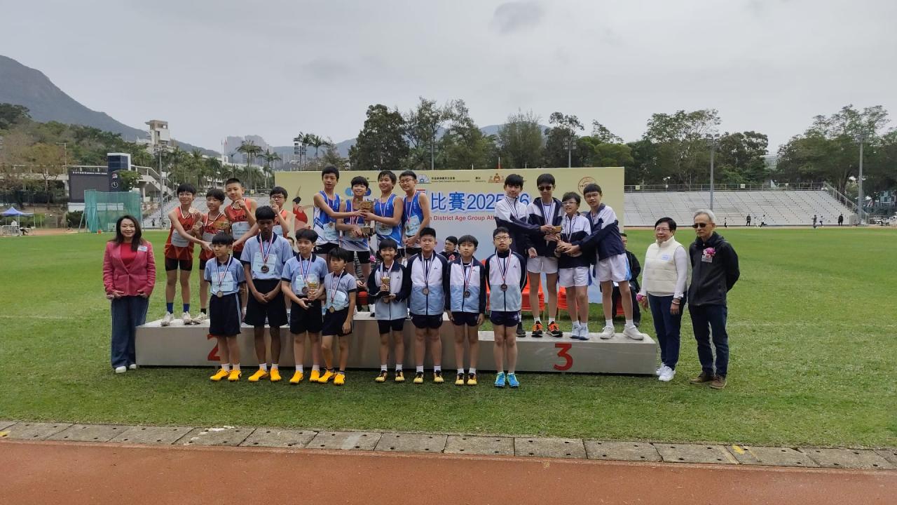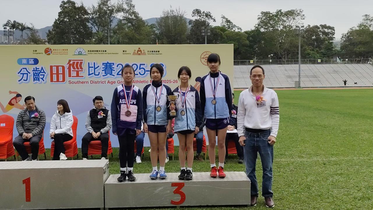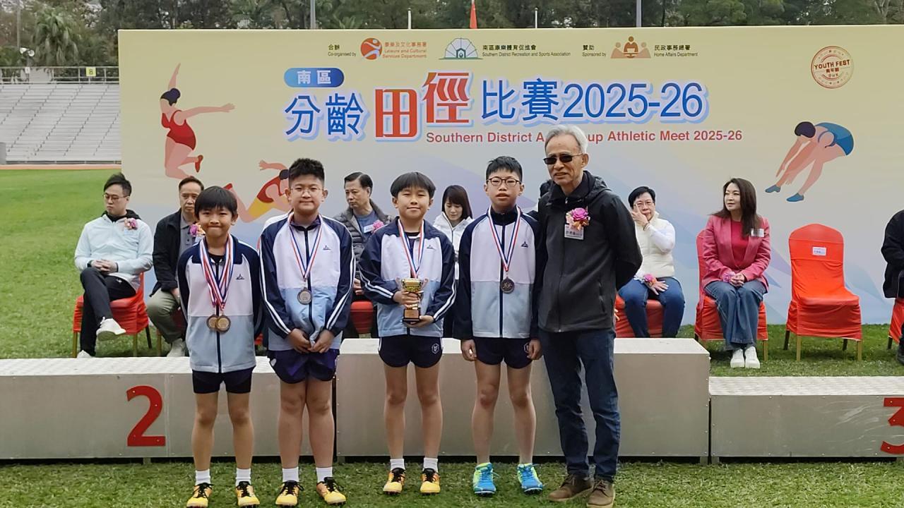 本校的田徑隊隊員於2月1日參加由康樂及文化事務署及南區康樂體育促進會合辦的「南區分齡田徑比賽2025-2026」。今次比賽共有27位隊員參加,各隊員於比賽中都全力以赴,盡力爭取獎項。當中,6A班朱凱婷、6B班徐芷熙、羅潔恩及6D班周珈睿於小學(女子組)4x100米接力邀請賽獲得季軍;而6A班梁振豐、6C班劉永軒、羅朗熙及6D班梁向軒亦獲得小學(男子組)4x100米接力邀請賽優異獎,為校爭光﹗